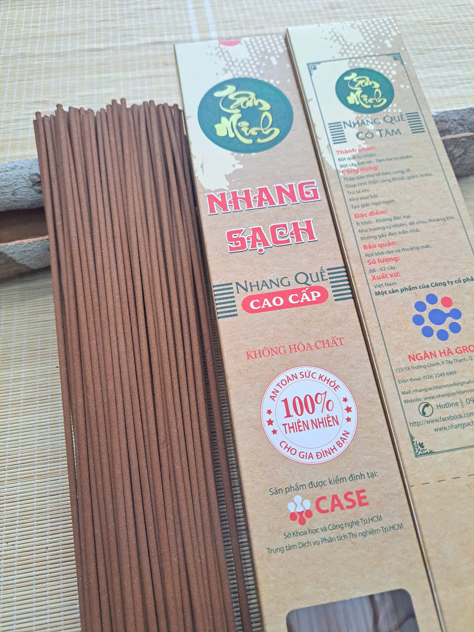 Nhang Quế Cao Cấp của Nhang Sạch Tâm Minh được dùng 100% nguyên liệu từ cây quế (bột vỏ cây quế), dùng keo bời lời và tăm tre tự nhiên. Không sử dụng bất ký hóa chất nào.